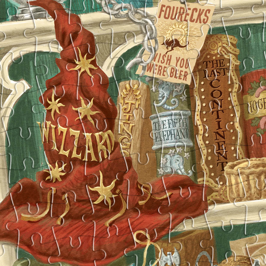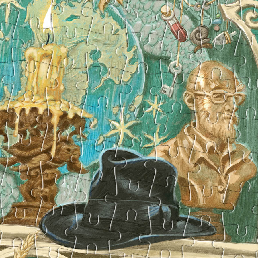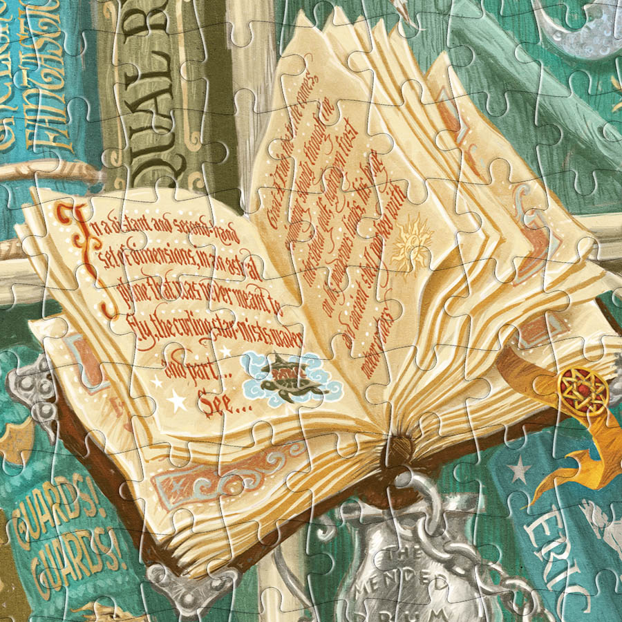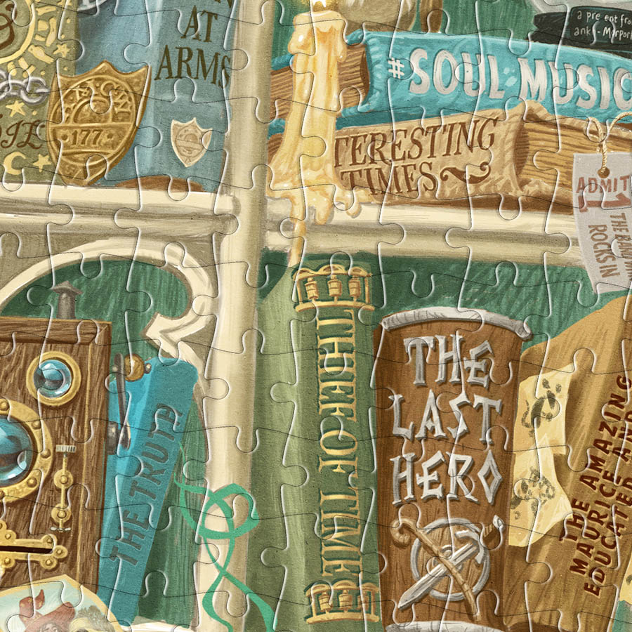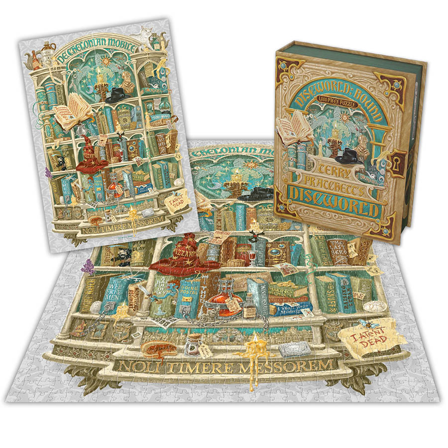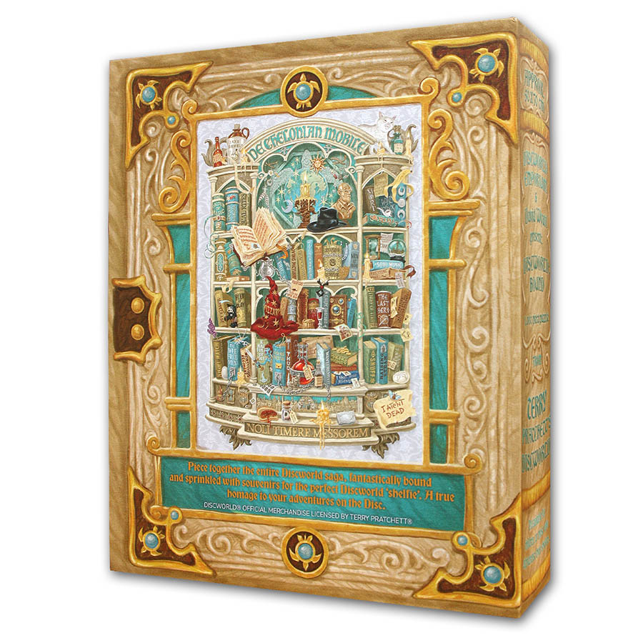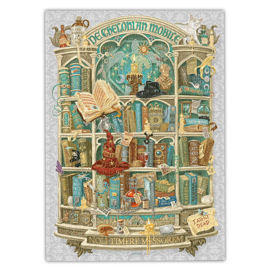 Build a dream bookcase with our puzzling pictorial love letter to Terry Pratchett’s Discworld . . . in one thousand pieces! In this lovingly illustrated imagining you’ll find an incredible curation of Discworld books and souvenirs . . . plus a character or two who have escaped the pages!