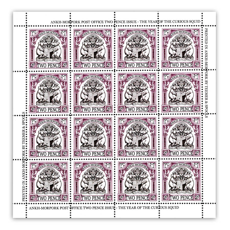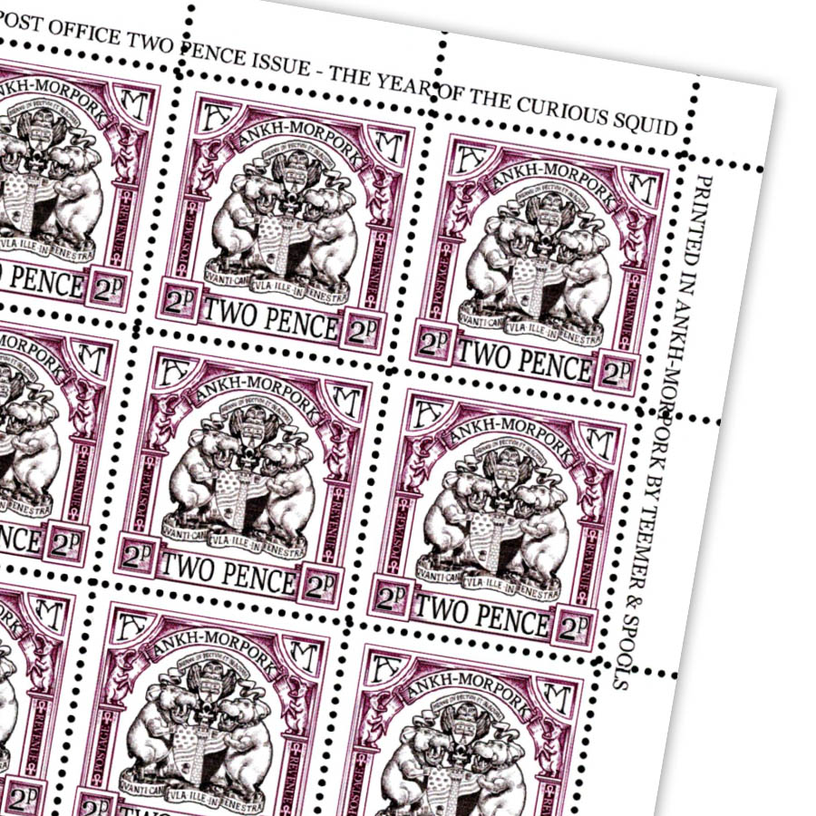 This definitive issue for the Year of the Moribund Aardvark is printed by Teemer & Spools in Ankh-Morpork, and traditionally produced on authentic gummed stamp paper & perforated by hand.