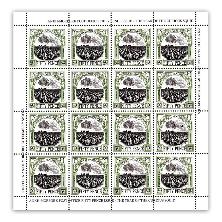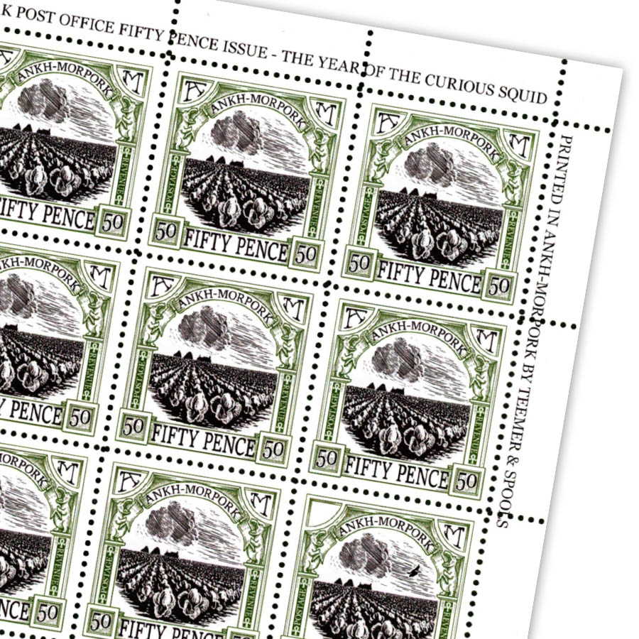 Printed in Ankh-Morpork by Teemer and Spools, this perennial Discworld Stamp pays homage to the infamous cabbage stamps from the pages of Terry Pratchett’s books Thud! and Making Money! This verdant postage stamp celebrates the brassica fields beyond the city walls that provide sustenance (and flatulence) to the good folk of Ankh-Morpork!